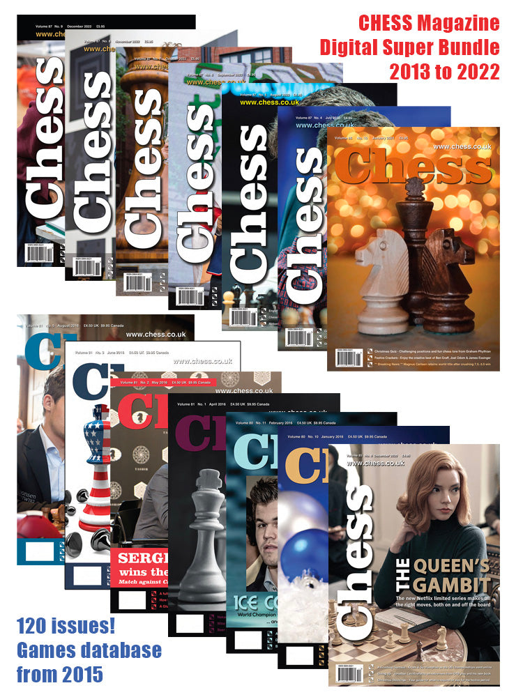 This huge digital bundle includes every issue of Chess Magazine published between January 2013 to December 2022. That's 120 issues! So much high quality chess content at an incredible low price. Enjoy at your leisure, an entire decade of Chess history at your fingers tips.