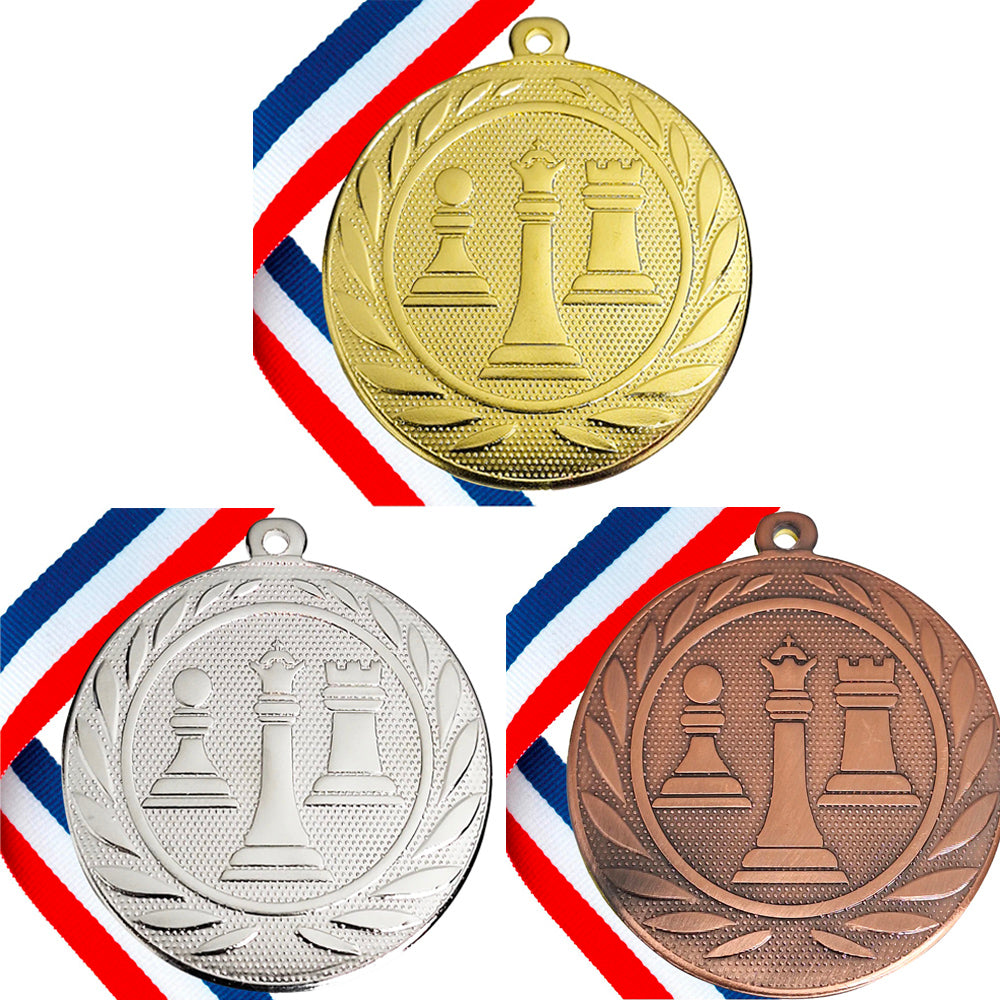 A cool design embossed Chess Medal on a red, white & blue Ribbon - perfect for club and school tournament prizes.