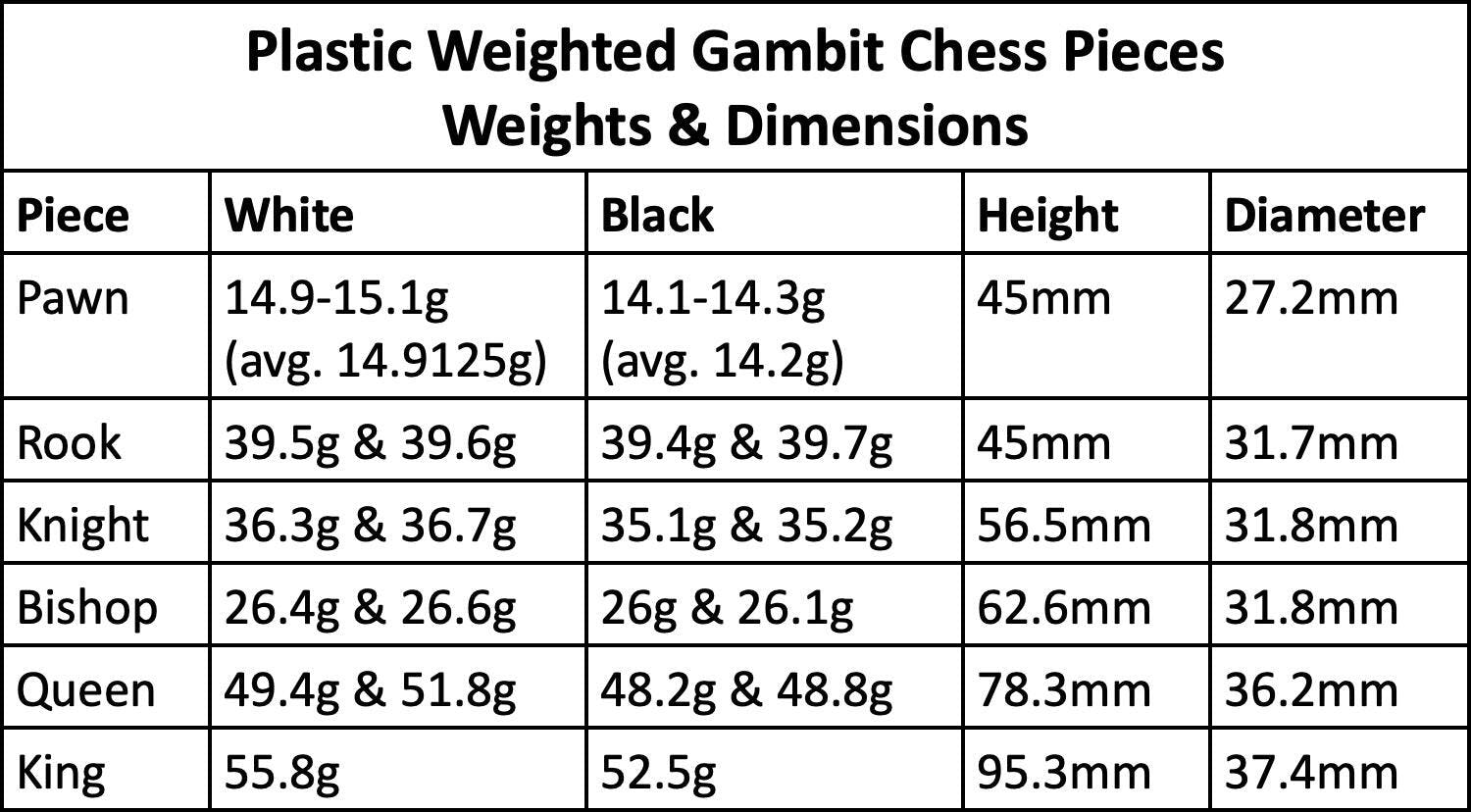 The Plastic Weighted Gambit Chess Set is made from a very durable plastic - this is the weighted standard set you'll find used in chess clubs, schools and tournaments worldwide. Comes packaged in a clear polybag. King measures 95mm / 3.75" which is a standard tournament size. Base diameter of pieces is 35mm / 1.4".