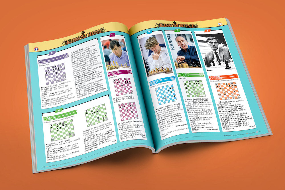 Our special feature showcases 35 games illustrating the art of the king hunt. Exploring these examples will bring you tremendous joy – and perhaps even a few laughs – as they highlight the imagination, courage and calculating power of fearless attackers past and present. Many of these masterpieces feature daring sacrifices, wild king walks, and brilliant finishes, all in pursuit of the ultimate goal: checkmating the enemy king in the open.