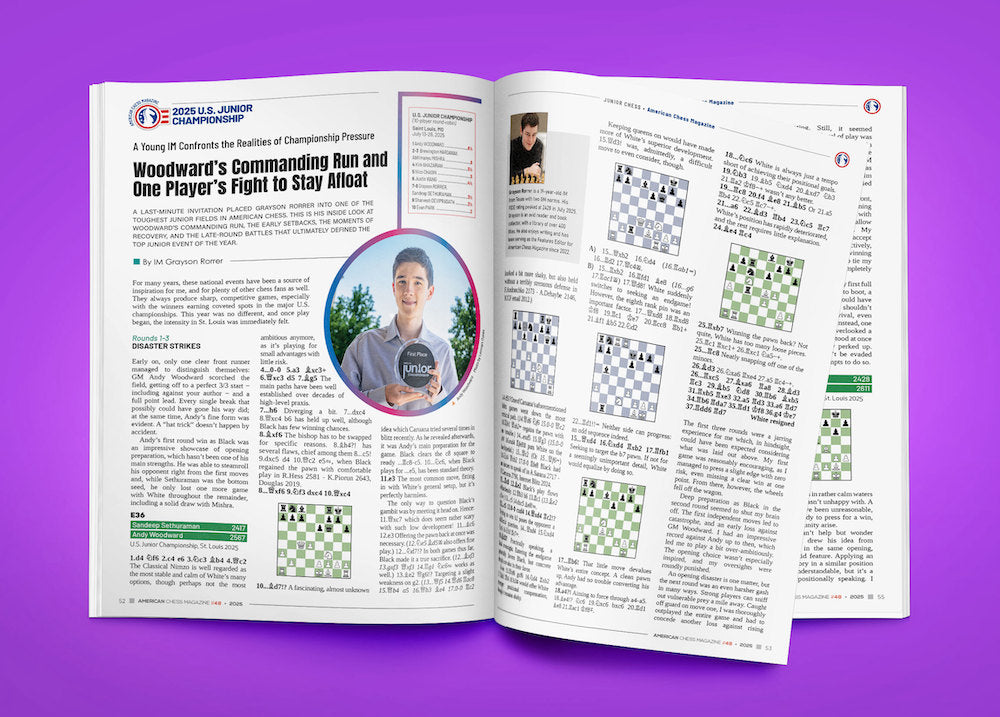 When it comes to junior chess, this issue offers in-depth coverage of the 2025 U.S. Junior Invitational and Open Championships. First, IM Grayson Rorrer reports on the commanding run by GM Andy Woodward, who ultimately clinched his first U.S. Junior title. Through a personal retrospective, Grayson shares an engaging account of the challenges he faced in this exceptionally strong tournament and the valuable lessons he learned along the way.