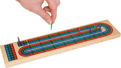 The game of Cribbage deserves a classic wooden Cribbage board. With three scoring lanes in red, green and blue, this slim, compact board is easy to carry and perfect for enjoying cribbage wherever you go. Includes plastic pegs for keeping score.